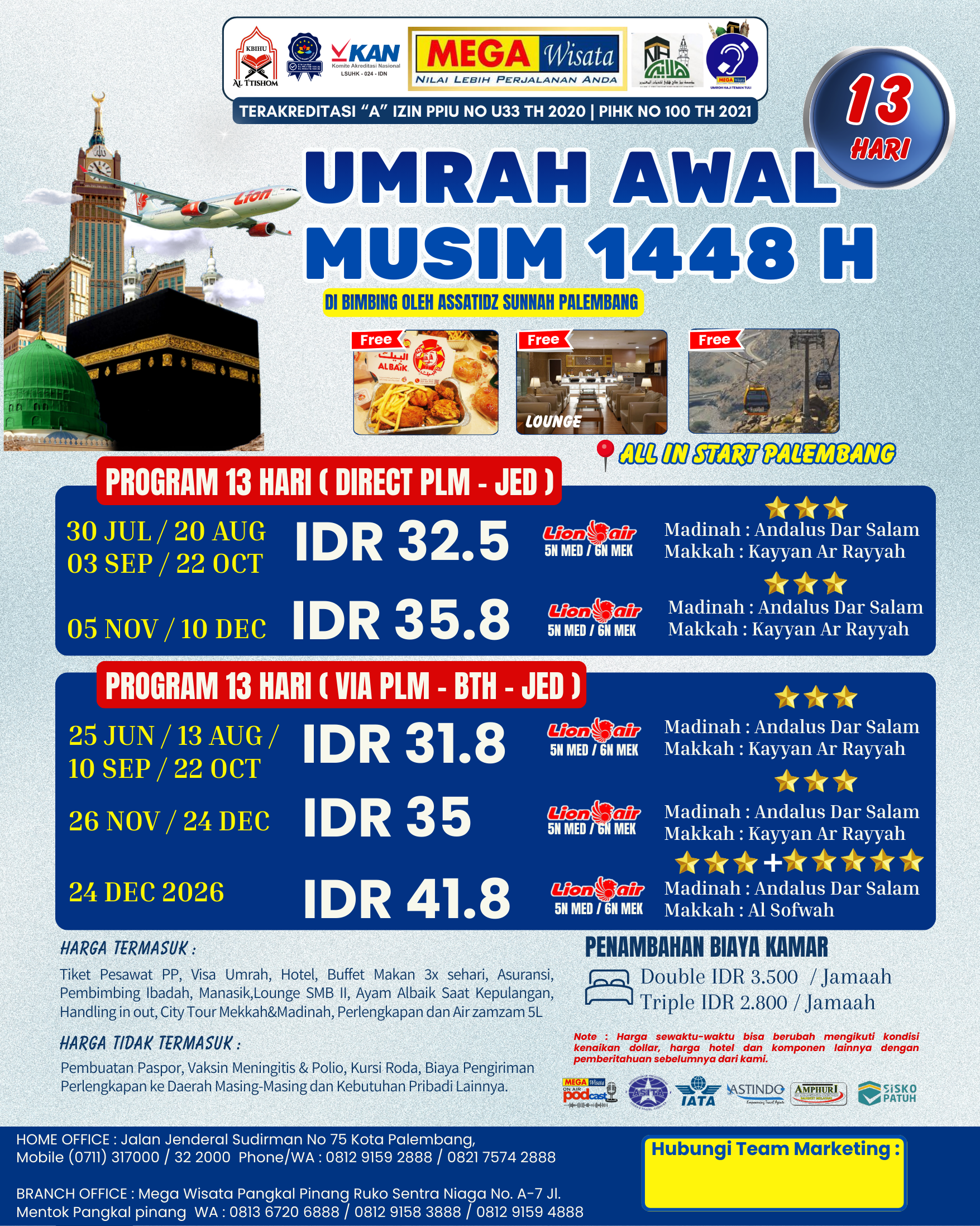Sebagai perusahaan yang bergerak di bidang tour dan travel di Kota Palembang, Mega Wisata memiliki prinsip untuk selalu pengutamakan nilai lebih pada layanan perjalanan Anda. Khusunya untuk perjalanan Ibadah haji, umrah dan wisata lainnya!!